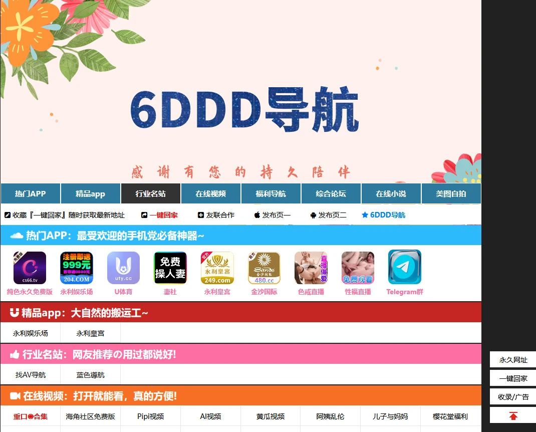 6DDD导航。这是一个以成人导航聚合为核心的平台,整体界面清新简洁,以花卉背景与色彩分区营造轻松氛围。首页分区明确:热门APP推荐、精品APP、行业站点、在线视频、精品导航、综合论坛、在线小说与热门直播等模块一目了然。无论是想找手机端的看片软件,还是直接在线浏览番号视频,或进入社区交流与小说专区,都能在这里直达。整体定位是一个集资源整合、分区导航与多入口推荐于一体的全能型成人导航站。