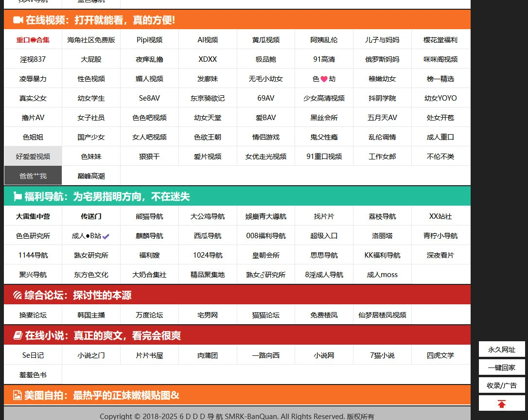 《星空入口》是一个定位于“成人资源站快速通道”的聚合导航平台,致力于整合和引导访问全球范围内的在线视频、论坛、小说、动漫等内容资源。站点将上百个高频使用站点通过图块式分类呈现,以“在线视频”“老司机导航”“小说资源”“动漫专区”等标签划分,打造一个操作直观、结构简洁的快捷入口体系,适合有明确观看需求或高频访问习惯的用户群体收藏使用。